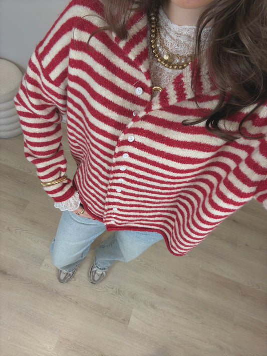 Gestreepte trui/vest met knoopjes - rood/creme