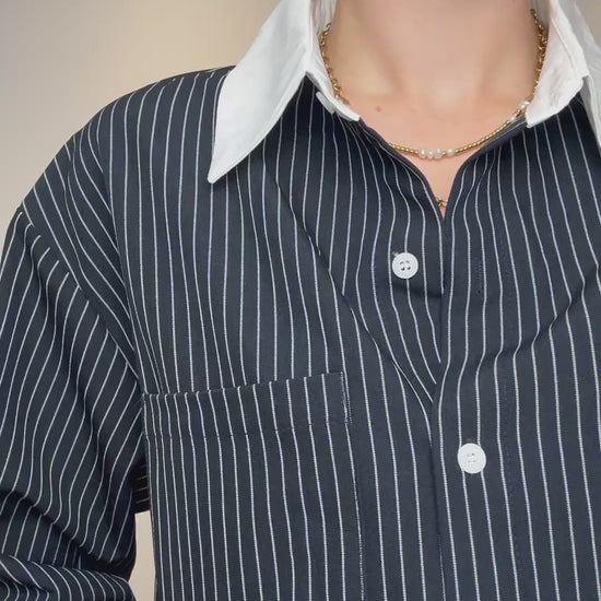 Wauwie, deze donkerblauwe blouse met witte streep en kraag is zó gaaf! 💙