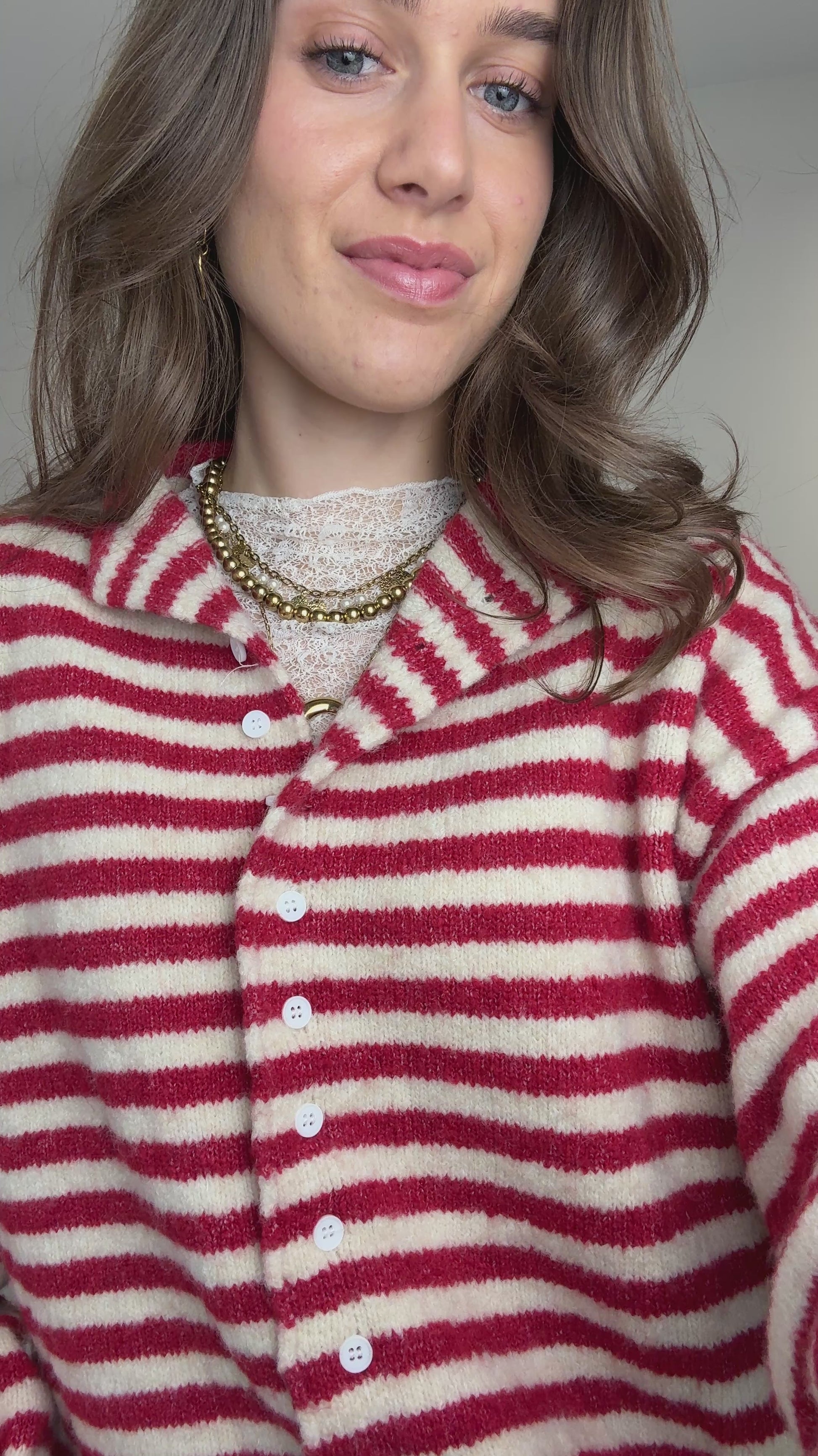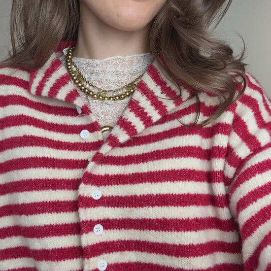 Dit rood-crème gestreepte vest met knoopjes is heerlijk zacht en geeft elke outfit een speelse twist. Perfect voor het voorjaar en makkelijk te combineren!