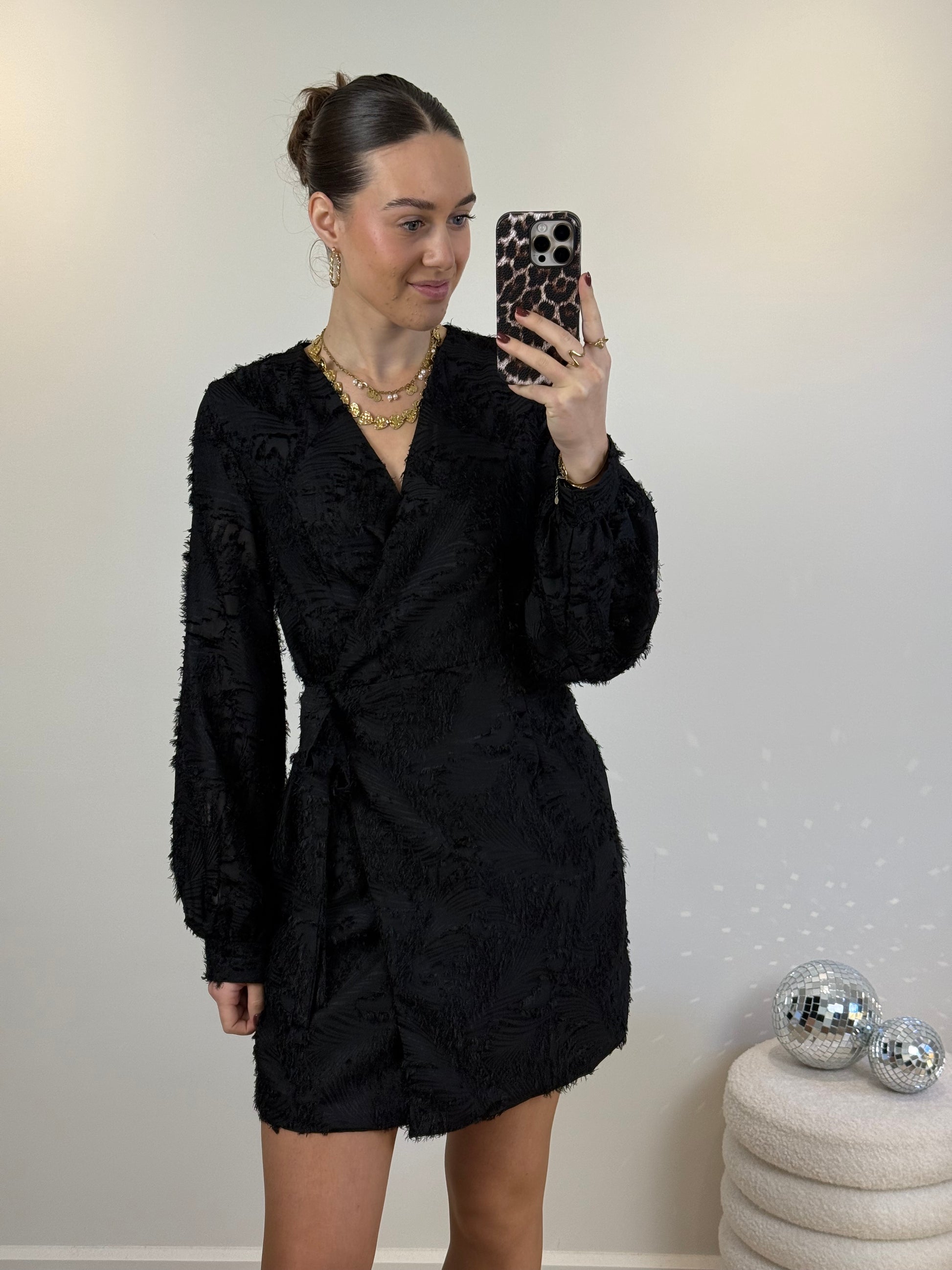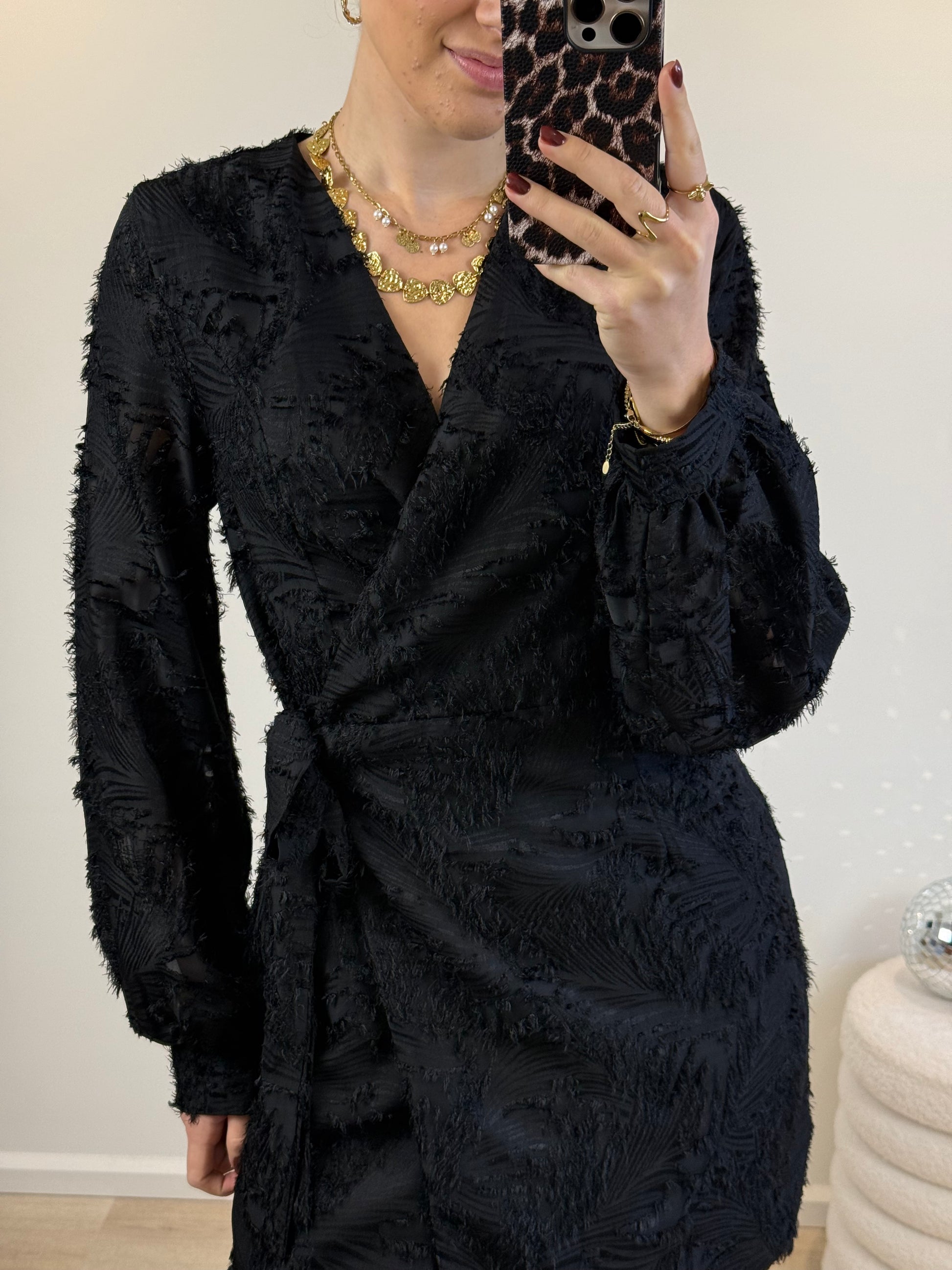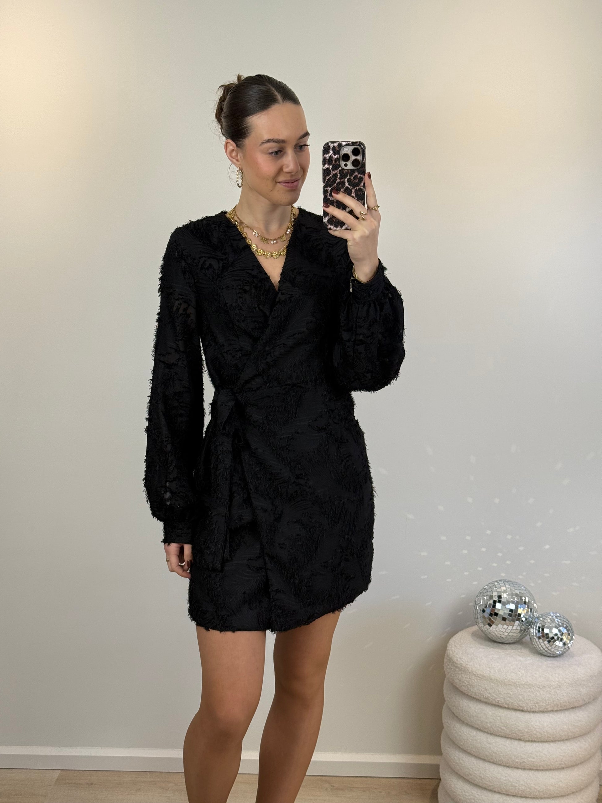 Dit overslagjurkje met fransjesstof is zó leuk voor de feestdagen! 💃 De harige stof is helemaal in en het model valt supermooi in de taille. Draag met hakken of laarsjes en you’re ready to dance all night, of top voor bij het eten met Kerst.