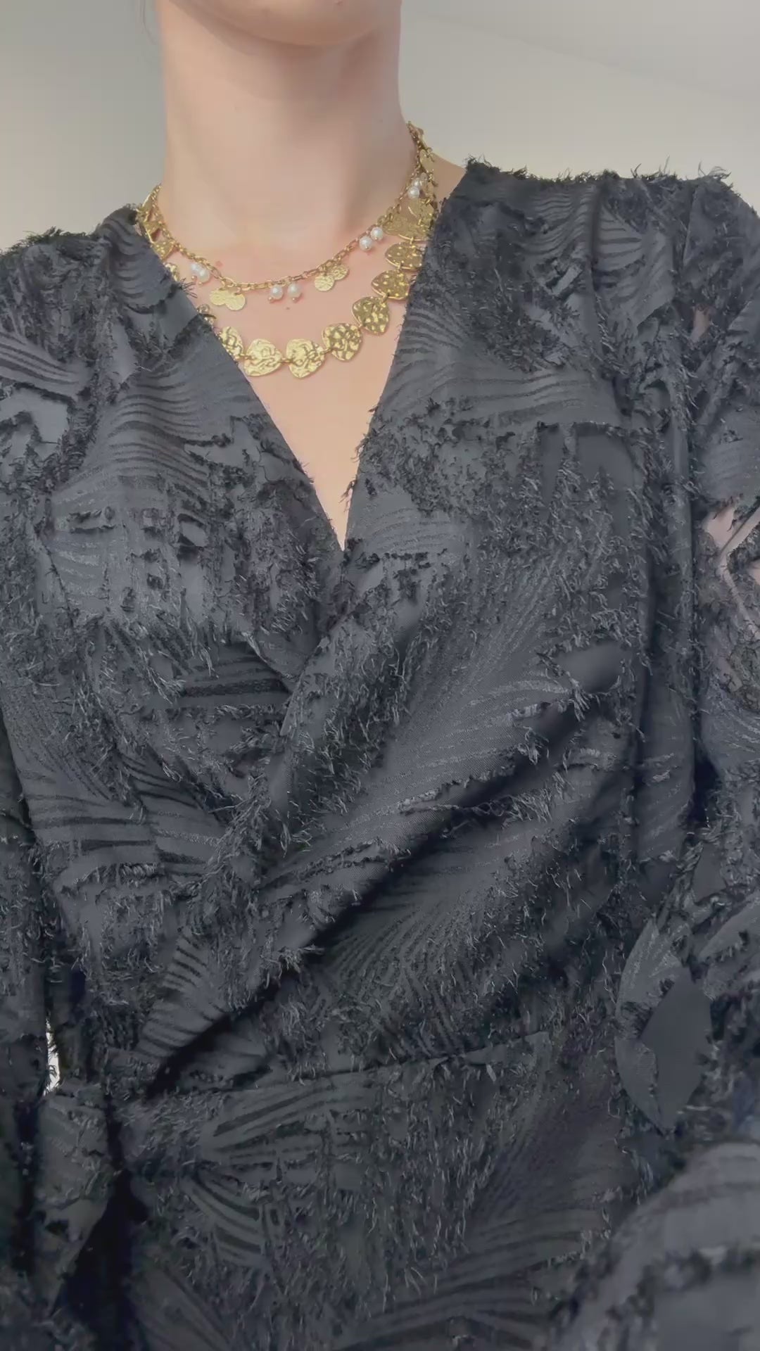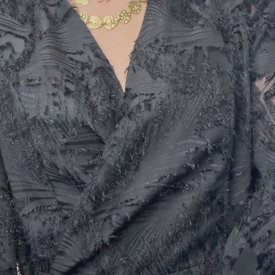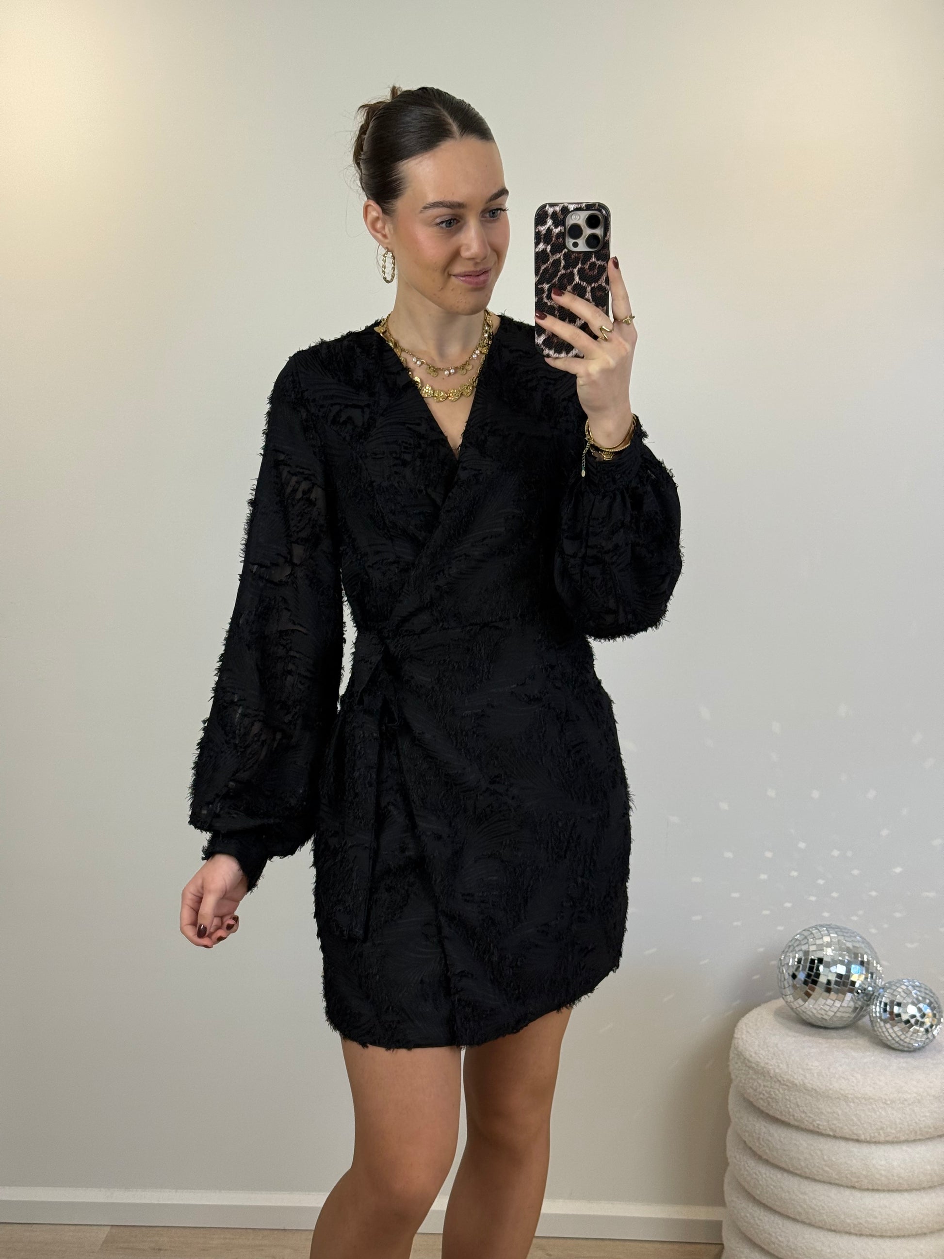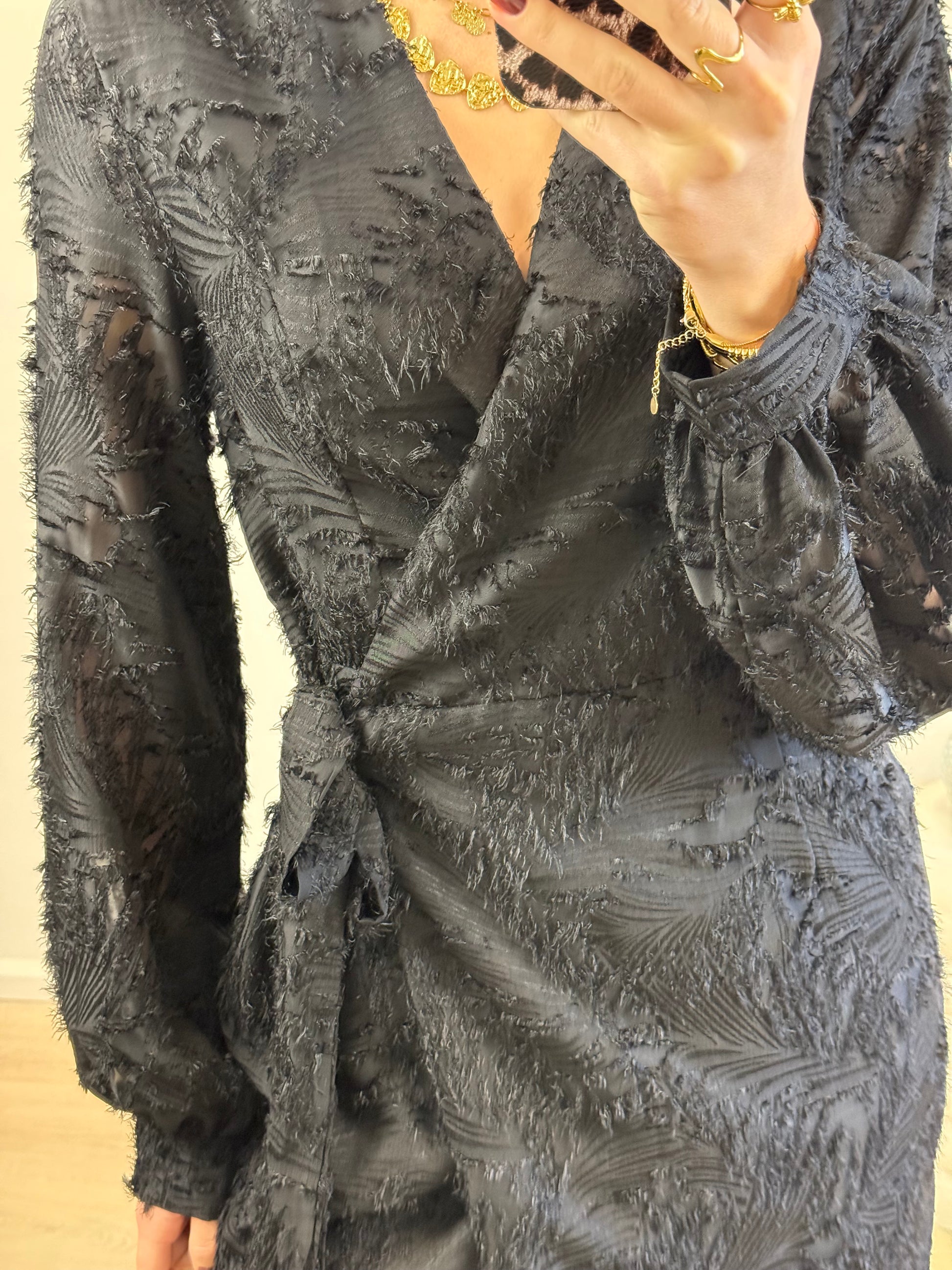 Dit overslagjurkje met fransjesstof is zó leuk voor de feestdagen! 💃 De harige stof is helemaal in en het model valt supermooi in de taille. Draag met hakken of laarsjes en you’re ready to dance all night, of top voor bij het eten met Kerst.