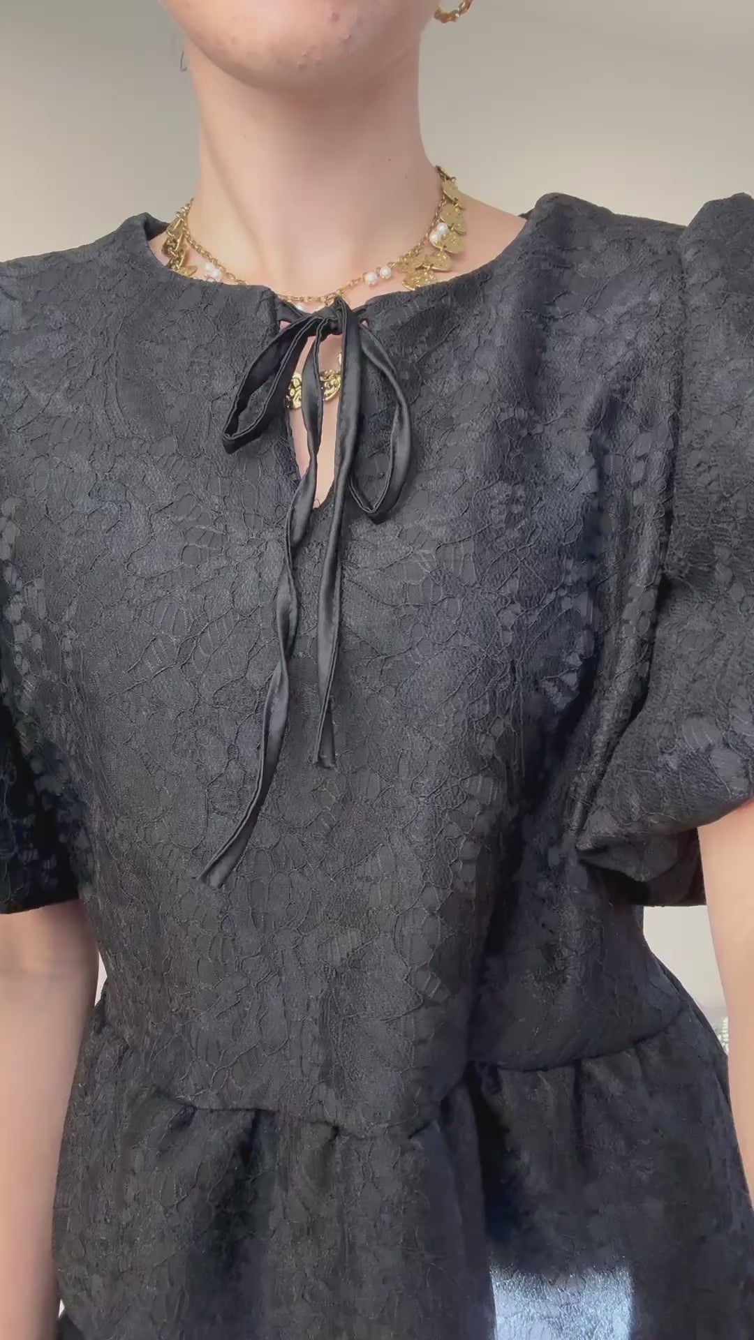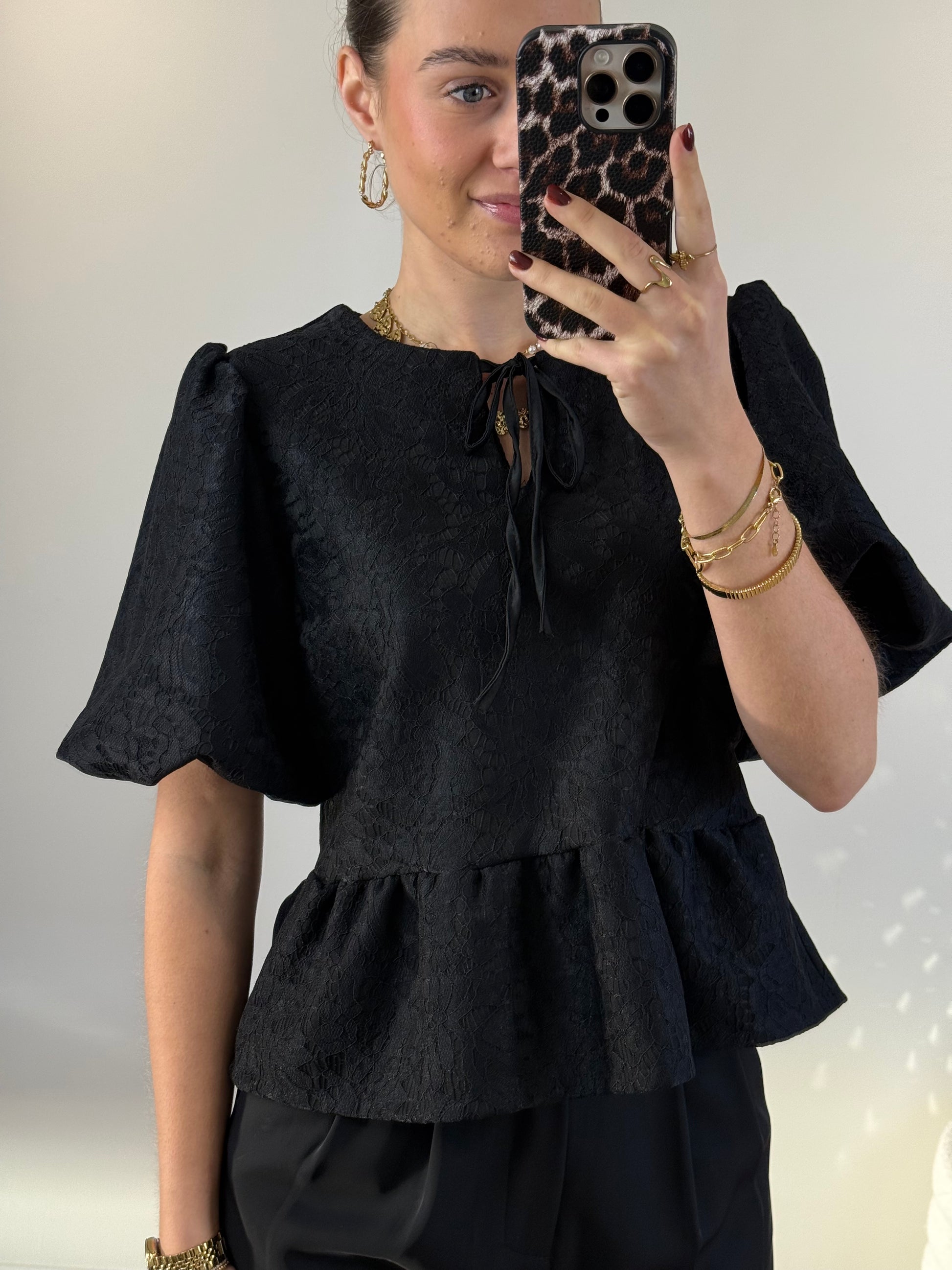 O-M-G girls… deze zwarte kanten top met pofmouwen is zooo leuk! 🖤 Je kunt het strikje zowel voor als achter dragen, twee looks in één. De stof is zacht, stretchy en perfect te combineren met een rokje of pantalon.