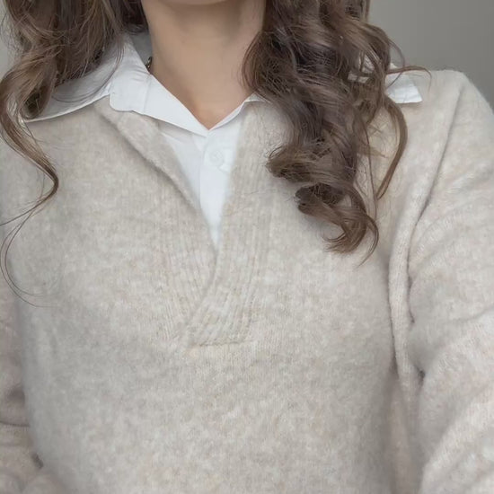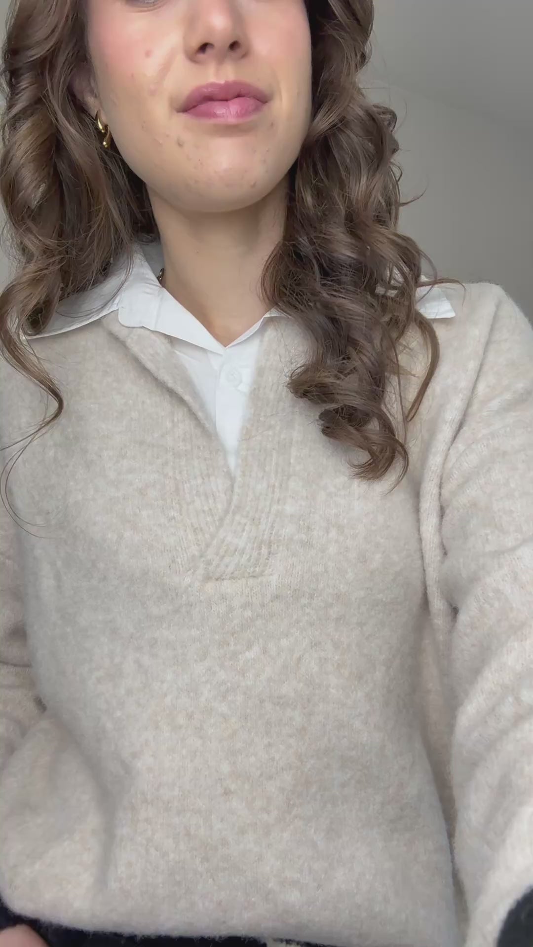 Deze beige trui heeft zóveel leuke details! 🤍 Het blousekraagje geeft een speelse touch en de zwarte strepen aan de onderkant maken hem extra leuk. Perfect voor een nette maar toch comfy look.