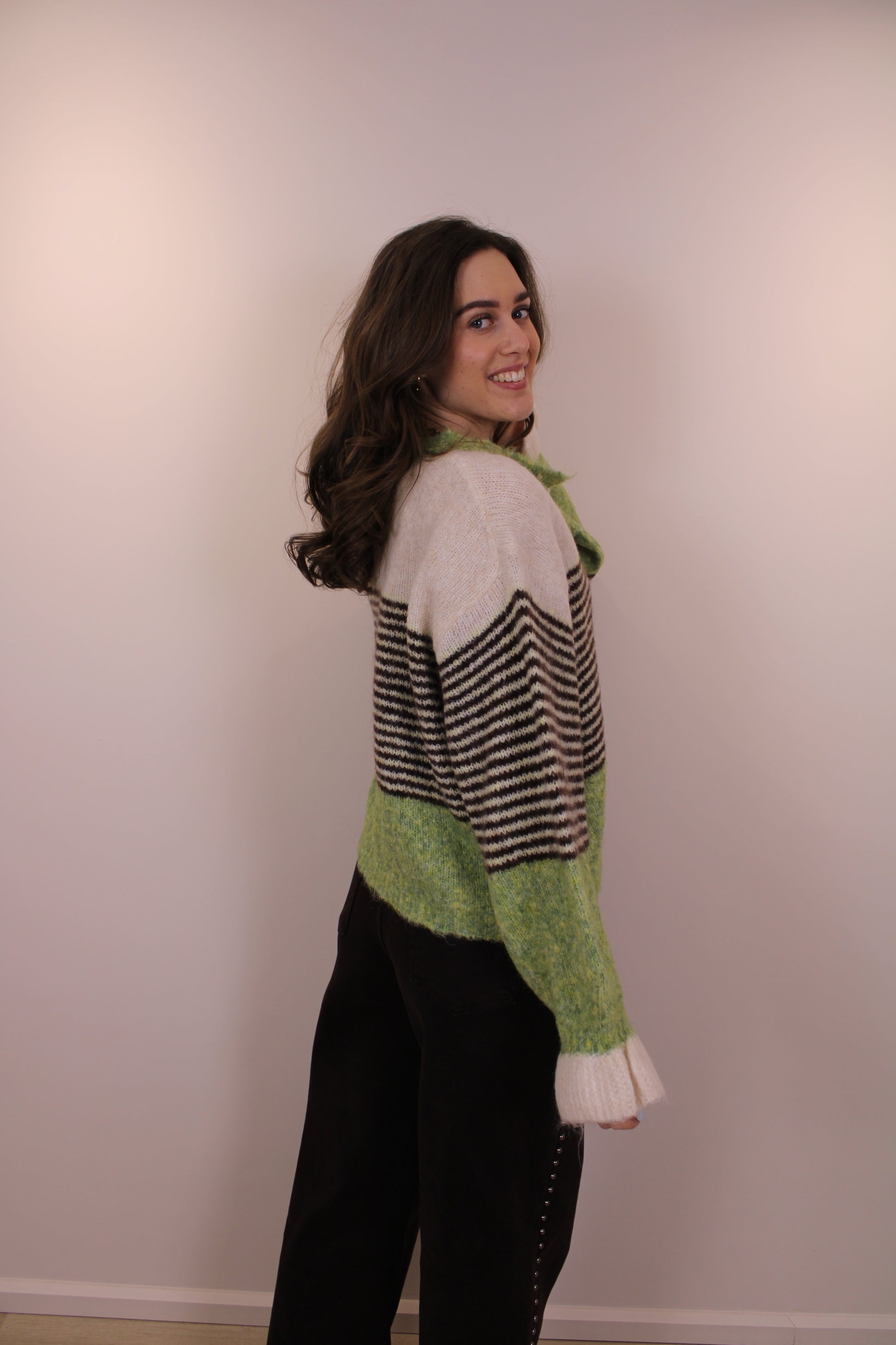 Wauww, wat een pareltje! Deze trui die je ook als vest kunt dragen is perfect voor iedere dag. De ruffles, subtiele streepjes en knopen zorgen voor een vrouwelijke en trendy look. Draag ’m open over een top of gesloten als comfy trui en style ‘m moeiteloos bij elke outfit.